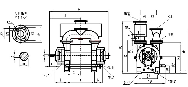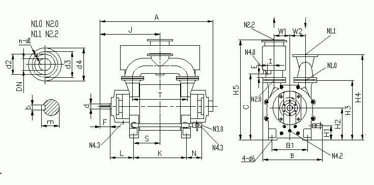 N1.0進氣(qì)端法蘭 N1.1連通(tōng)管法蘭 N2.0排氣(qi)端法蘭 N2.2分離(lí)器法蘭 N3.0工作(zuo)液接口 N4.0分離(lí)器排液口 N4.2沖(chòng)洗、排液口 N4.3洩(xiè)漏液排😄放口(kou)