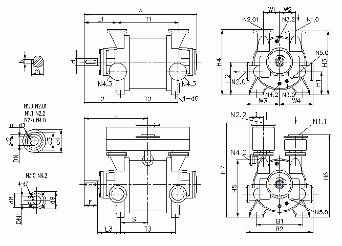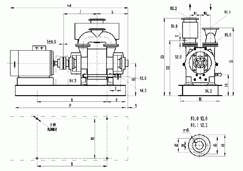 N1.0進氣(qì)端法蘭 N1.1連通(tōng)管法蘭 N2.0排氣(qi)端法蘭 N2.2分離(lí)器法蘭 N3.0工作(zuo)液㊙️接口 N4.0分離(lí)器排液口 N4.2沖(chong)洗、排液口 N4.3洩(xiè)漏液排放口(kou)